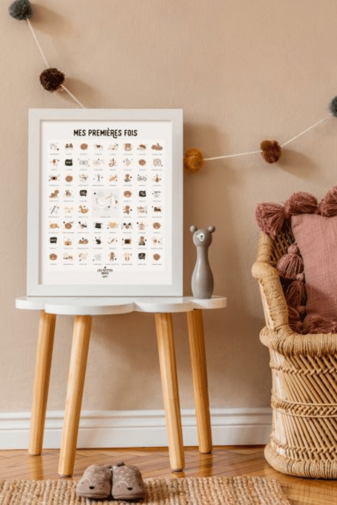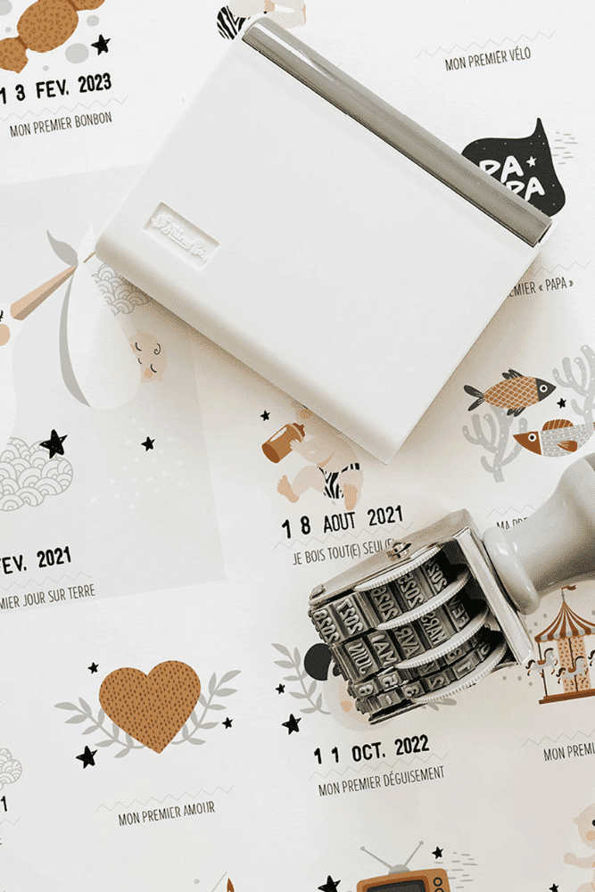 Souvenez-vous des petits moments qui comptent avec cette affiche des premières fois de bébé et son tampon dateur.