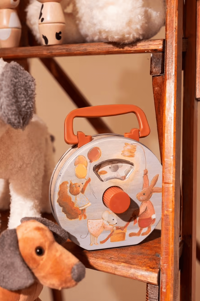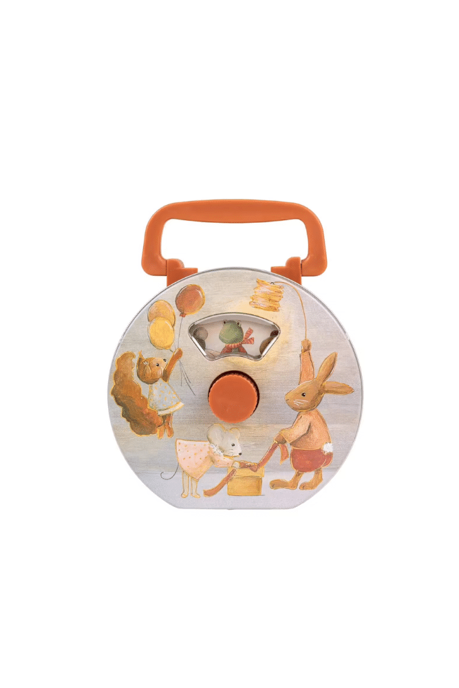 Cette boîte à musique en métal fonctionne sans piles. Elle peut être utilisée pour jouer ou pour aider les petits à s’endormir.