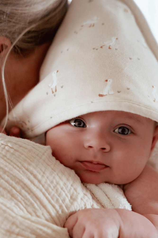 La capuche offre un confort et une sécurité supplémentaires après le bain.