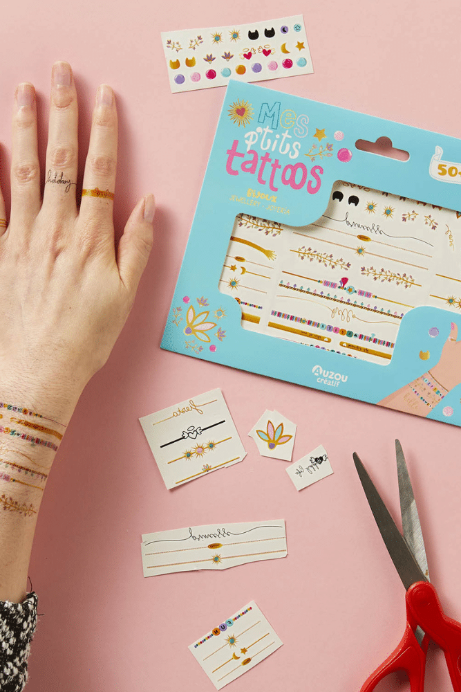 Dans cette petite pochette pratique, les enfants découvrent plus de 50 tatouages de bijoux et parures. Ils pourront porter ainsi des bracelets et bagues éphémères, et même des puces d’oreilles!