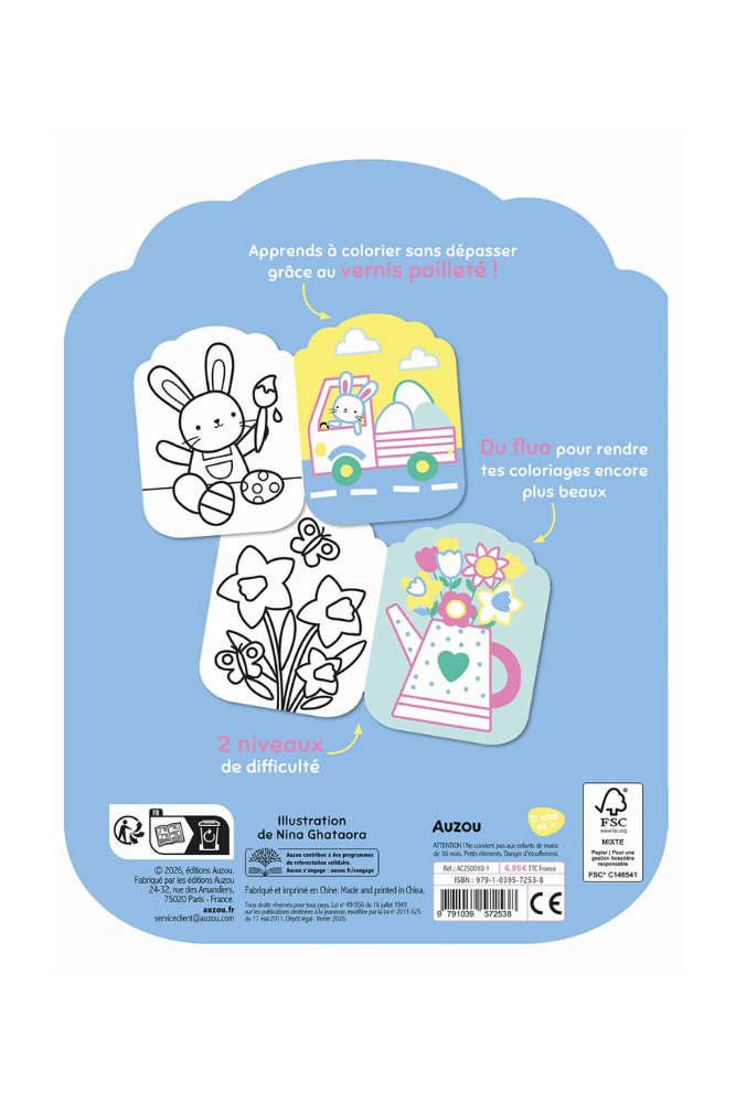 Découvez ce livre de coloriages fluos sur le thème de Pâques avec deux niveaux de difficultés : le premier niveau pour apprendre à bien colorier sans dépasser avec l’aide du vernis à paillettes et le deuxième niveau sans vernis à paillettes pour que votre enfant démontre ses talents.