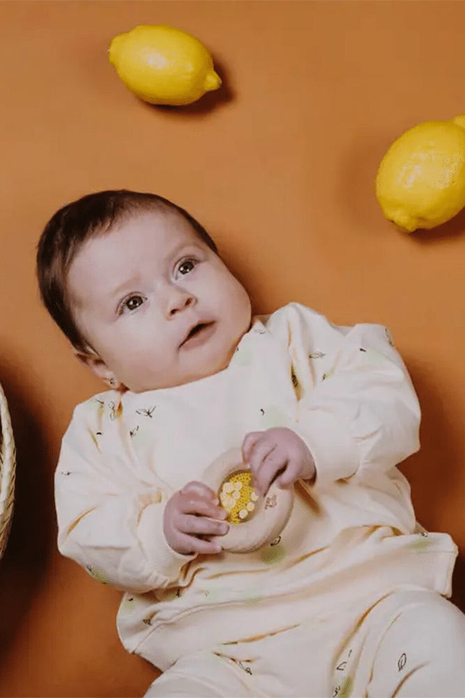 À l’intérieur, votre tout-petit pourra admirer des billes de couleurs ainsi que des petits citrons. Lorsque le hochet sera secoué, billes et citrons se mettront en mouvement et feront un léger bruit qui amusera votre bout de chou.