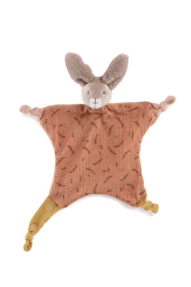 Compagnon bi-matières réconfortant aux grandes oreilles toutes douces, orné de délicats motifs d’un côté. Noué à chaque coin, il est facile à saisir par les petites mains.