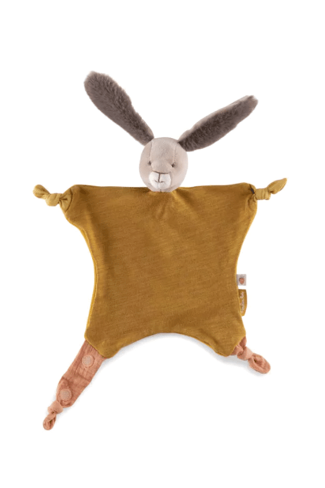 Découvrez ce doudou lapin Ocre avec son attache tétine.