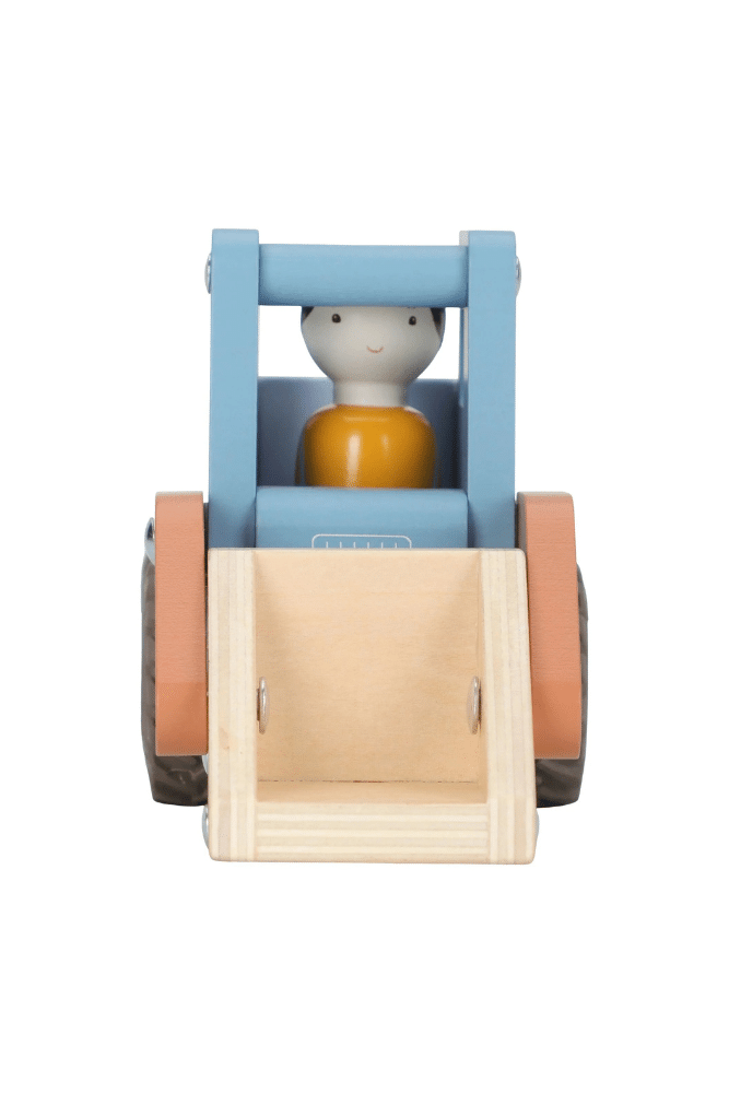 Le mini bulldozer robuste roule en douceur grâce aux roues en caoutchouc et est livré avec un ouvrier du bâtiment en bois.