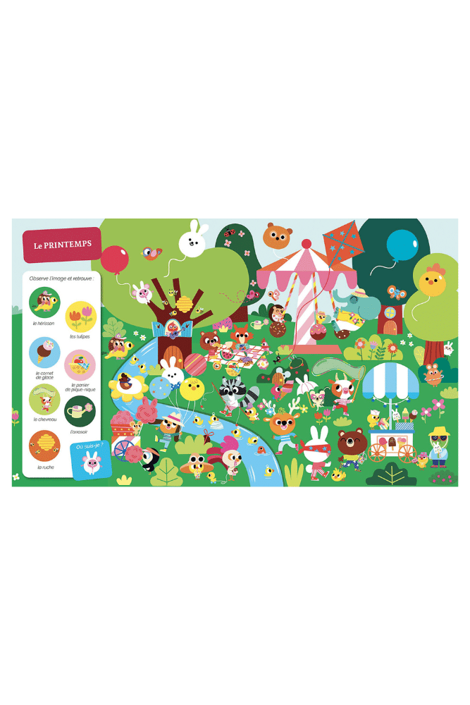 Découvrez le livre Cherche et trouve dédié aux plus petits avec 7 gros éléments à retrouver par page.