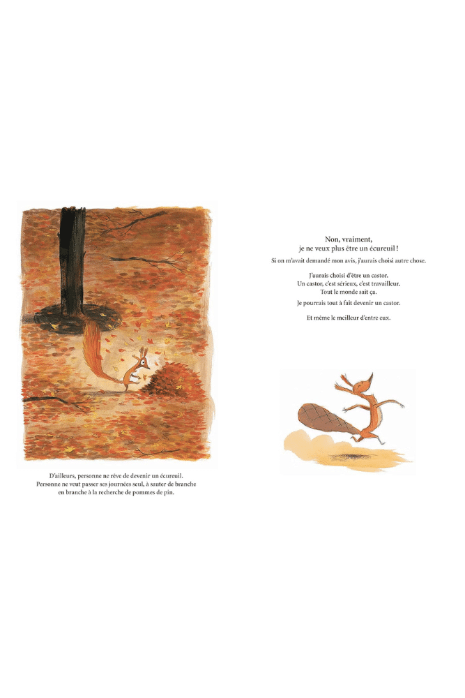 Je ne veux plus être un écureuil ! Si on m’avait demandé mon avis, j’aurais choisi autre chose. J’aurais choisi d’être un castor. Pour bâtir un monde meilleur ! Mais en réalité, c’est quand même fatiguant la vie de castor, et de toute façon, j’ai toujours rêvé d’être un cerf.