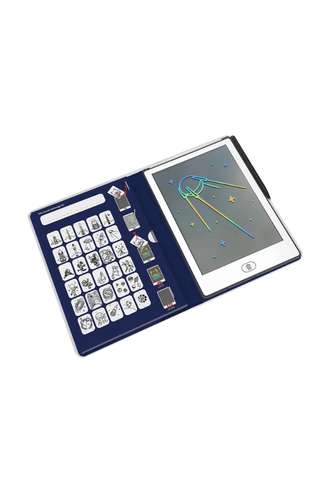 Offrez à votre enfant une expérience de dessin sans limite avec KIDYDRAW-MINI, un livre à dessins avec écran LCD proposant 30 illustrations à décalquer.