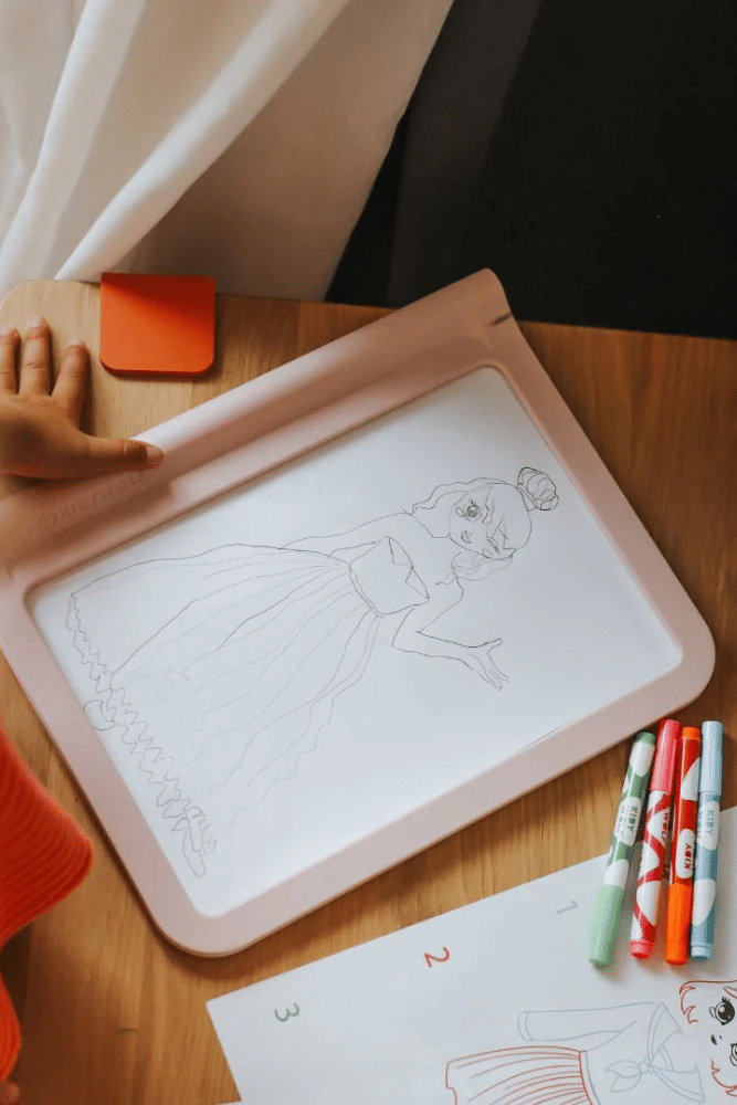 Avec KIDYDRAW-PRO – Fashion, l’enfant laisse parler son imagination : il décalque des silhouettes, compose ses tenues (plus de 1000 combinaisons possibles), puis retourne la tablette pour dessiner sur la surface noire fluorescente. Pas d’applis, pas d’internet, pas de Bluetooth : une activité artistique 100 % hors écran.